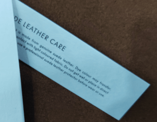 Besides, we will also suggest brand customers to have a notice/disclaimer hand tag on their products, to remind the characteristic of suede leather and how to avoid wearing light color clothing when carrying suede leather handbag.