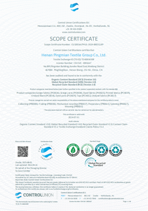Certification: GRS (Global Recycled Standard) certified. A Transaction Certificate (TC) is available for orders meeting MOQ.